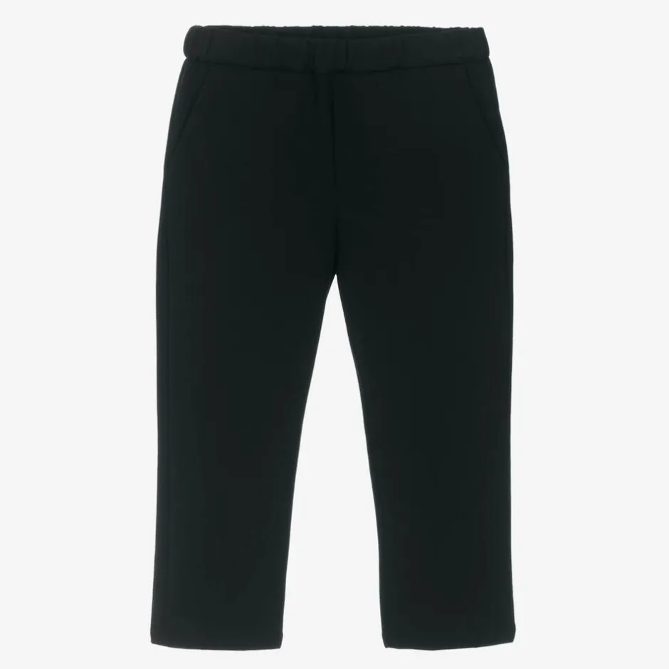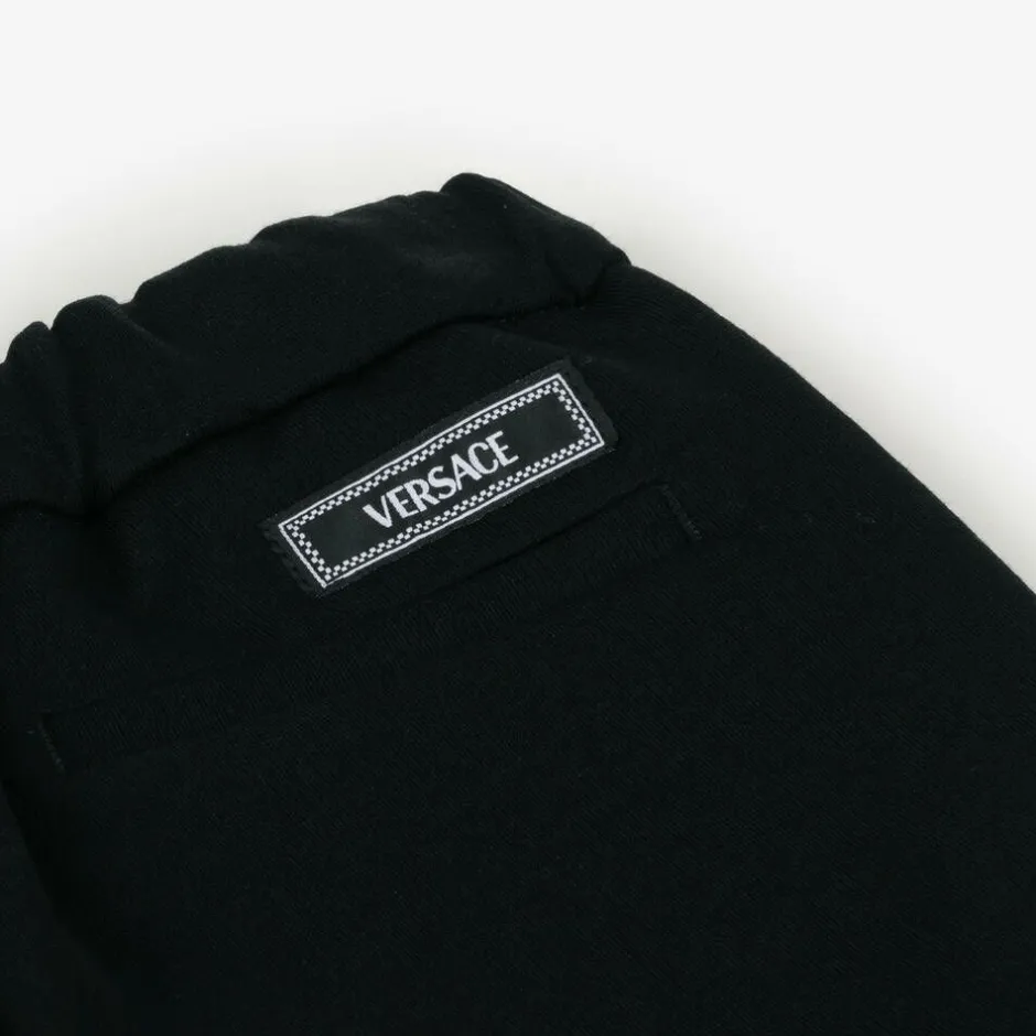 Both stylish and comfortable for younger boys, these black trousers by luxury label Versace, are made in soft Milano jersey. This smart design has slanted front pockets, a welt back pocket and a stretchy elasticated waistband. The Italian brand's distinctive logo patch can be seen on the back for instant designer appeal.