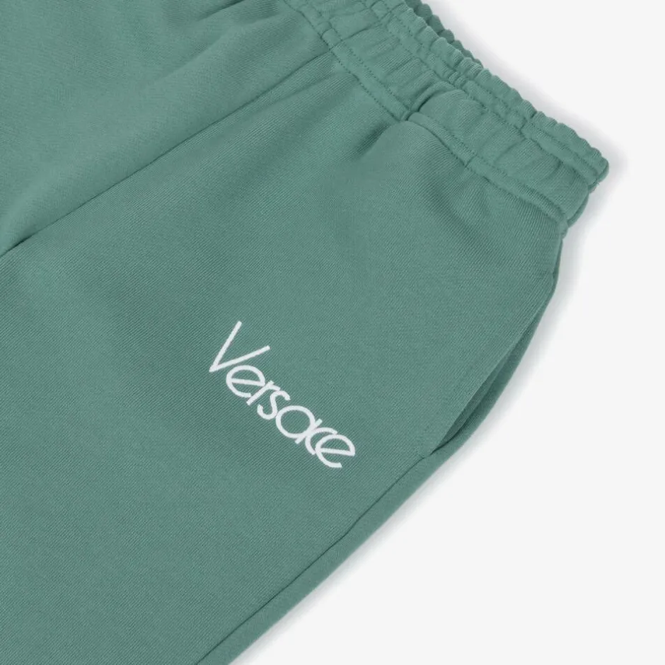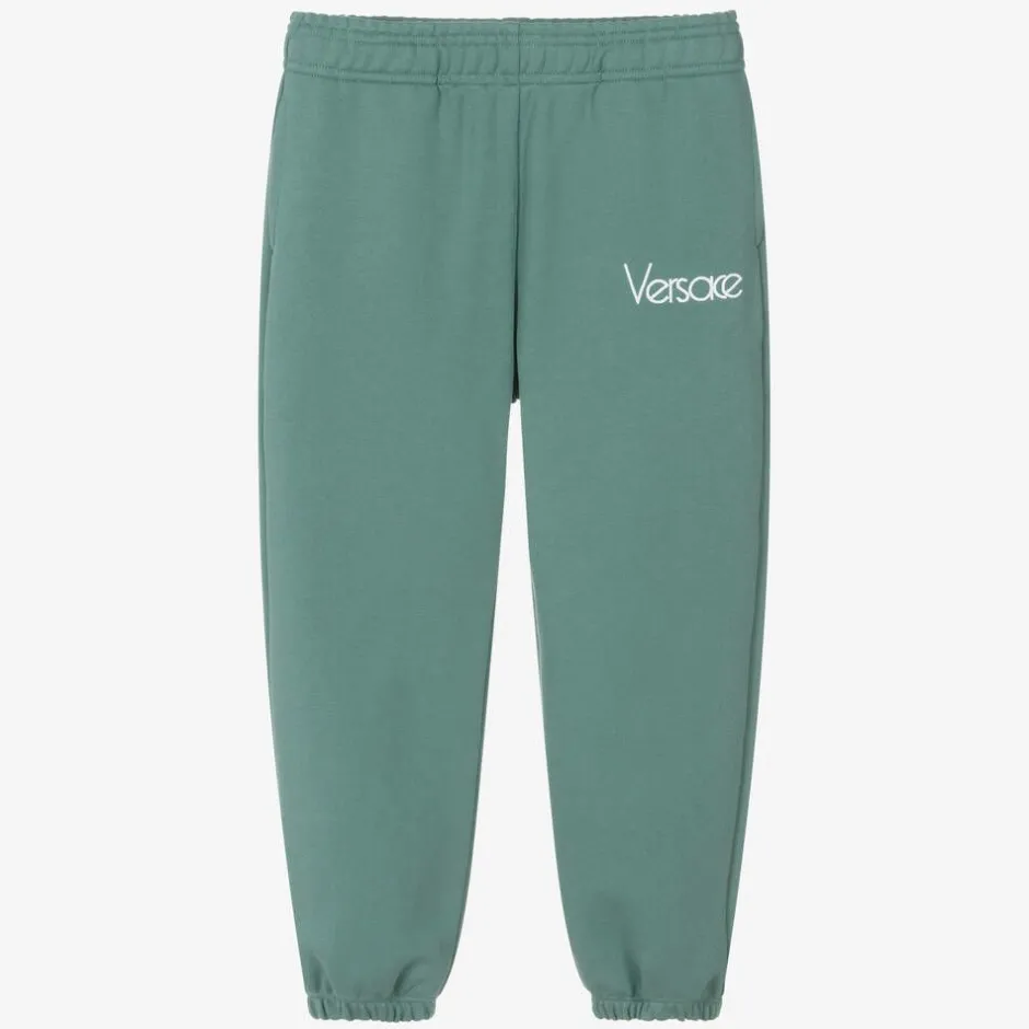 From Versace, a pair of green cotton joggers for boys with a white embroidered logo for instant recognition. To ensure comfort and warmth, these mid-weight jersey joggers have an elasticated waist and cuffs.