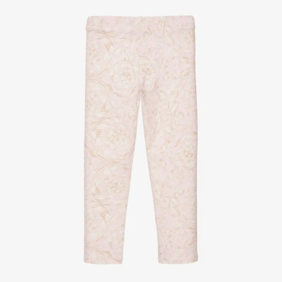 Girls pink cotton full-length leggings by luxury label Versace, patterned with the brand's ornate Barocco print in soft ivory hues. Both stylish and comfortable, they are made from soft jersey with a stretchy elasticated waistband.