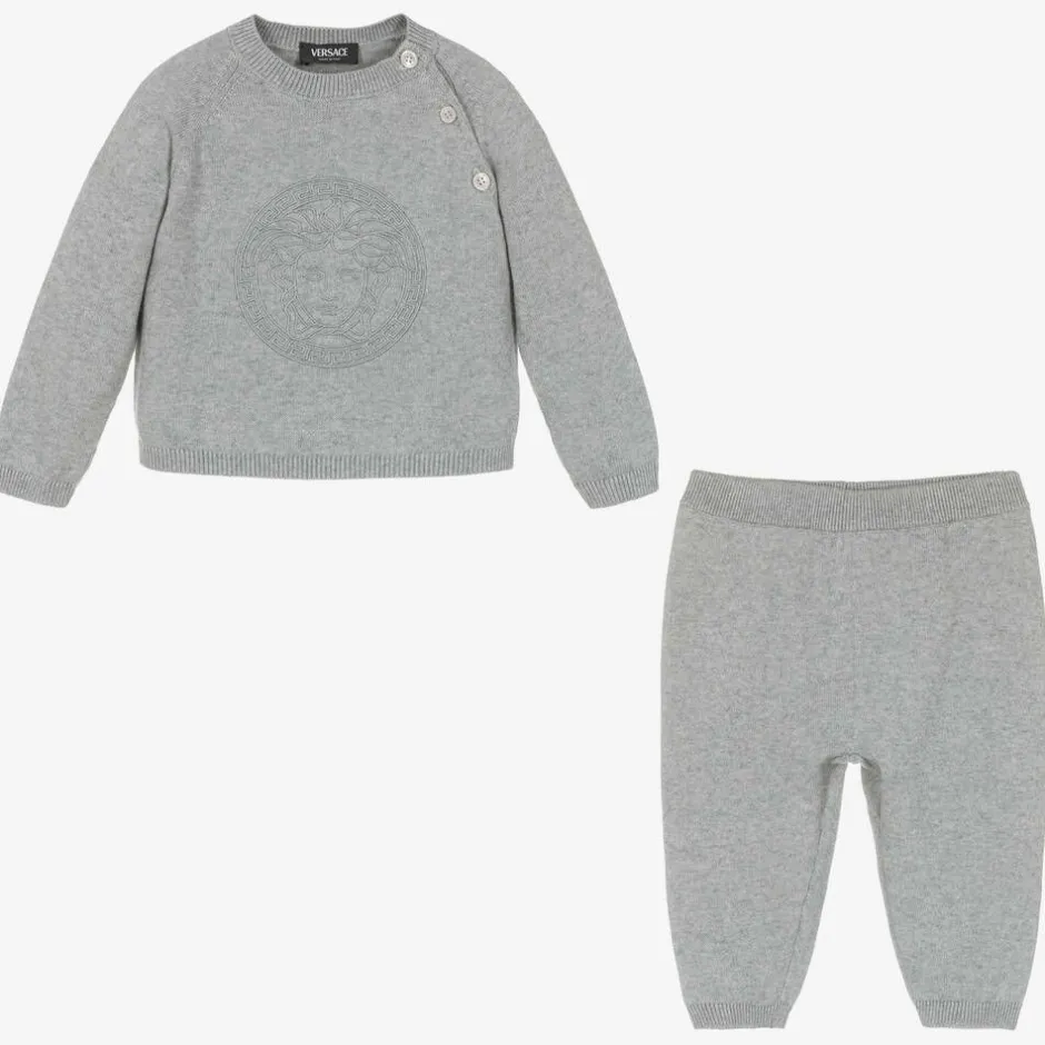 In luxurious cotton and cashmere, this light grey knitted trouser set for baby boys and girls is from Italian fashion house Versace. Enhanced by the designer's embroidered Medusa artwork, the sweater fastens with branded mother-of-pearl buttons on the shoulder and the cuffed trousers have an elasticated waist for lasting comfort. A wonderful present idea, these items come with a branded gift box.