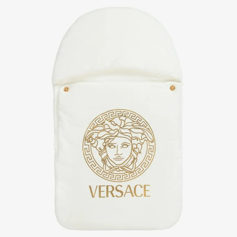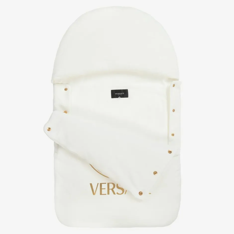 A soft and cozy ivory cotton jersey nest by Versace, suitable for boys and girls. Lightly padded, it has the brand's iconic Medusa logo printed on the front in gold foil. There are gold popper fastenings with matching Medusa emblems on both sides and a large snuggly hood.