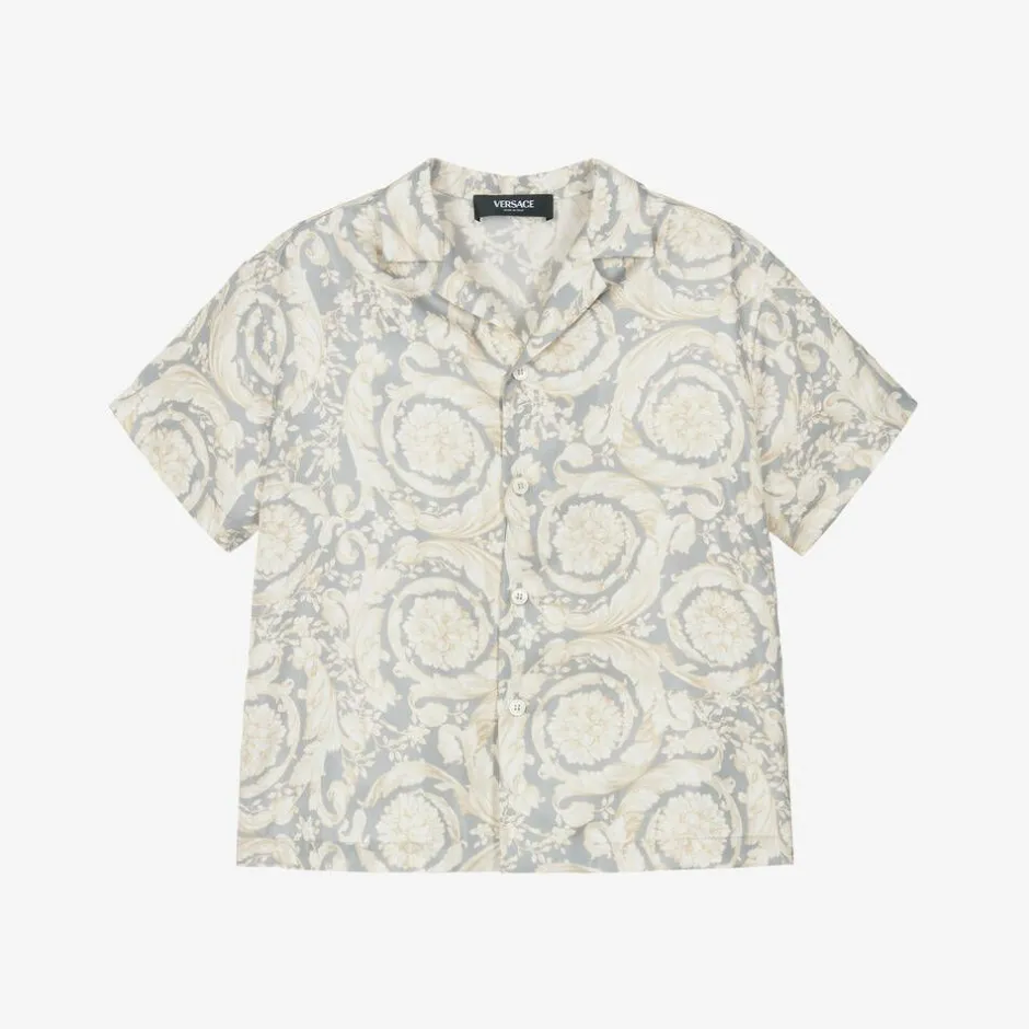 A stylish ivory and grey shirt for junior boys by luxury label Versace, patterned with the brand's distinctive Barocco print for instant designer appeal. Made in luxuriously soft silk twill, it is comfortably styled in a relaxed fit, with a revere collar and branded button fastenings.