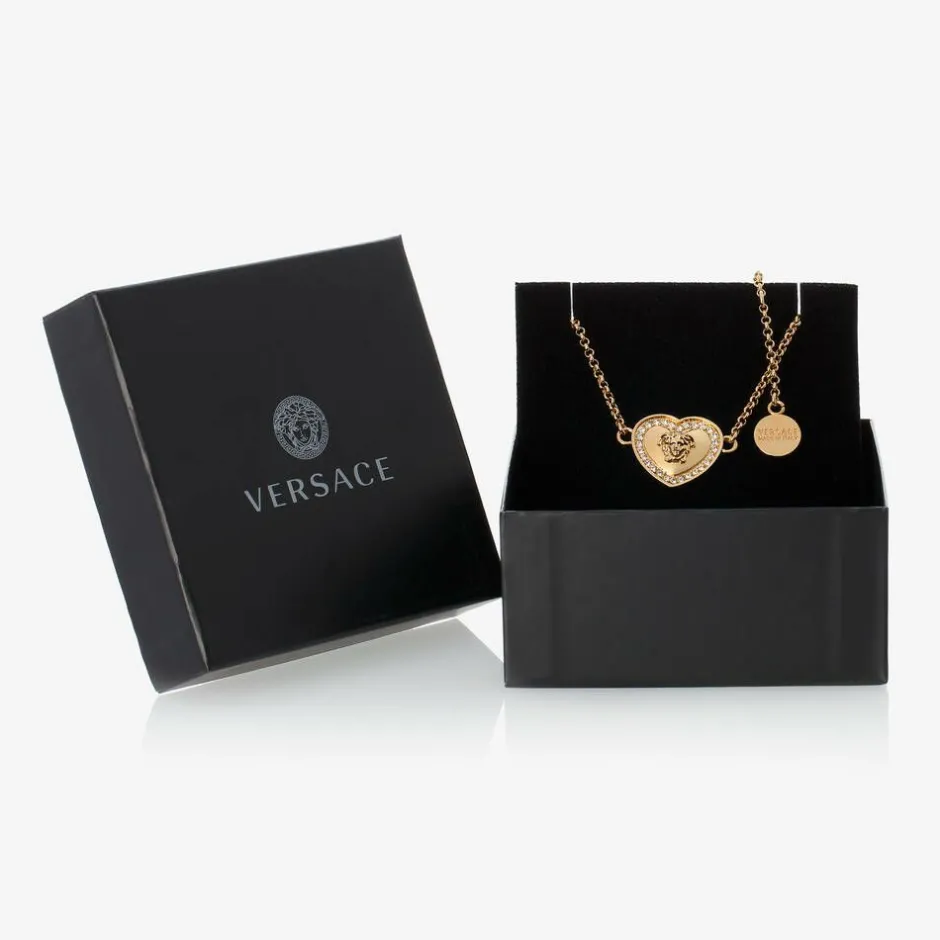 Beautiful gold coloured crystal heart Medusa bracelet by luxury brand Versace. The centre of the chain has a heart-shaped charm with a Medusa head logo in the centre surrounded by sparkly crystals. A small Medusa stamped charm is at the end of the chain. A lobster clasp secures the bracelet which has two adjustable sizes.