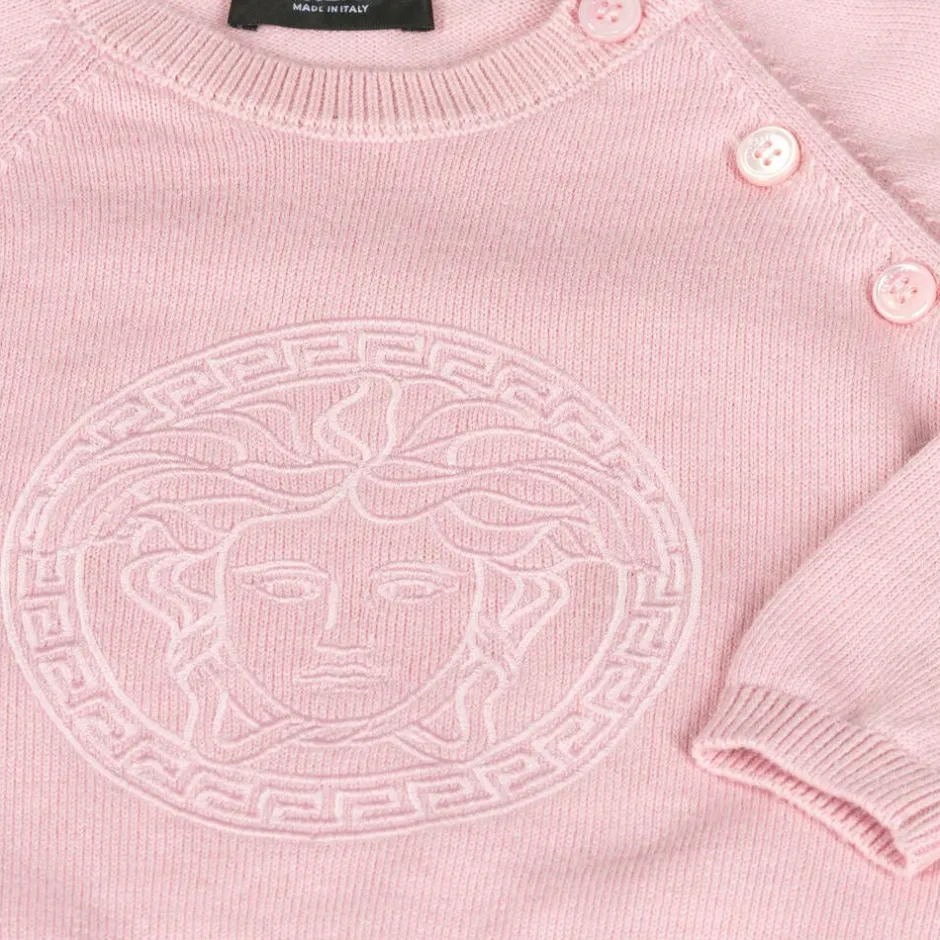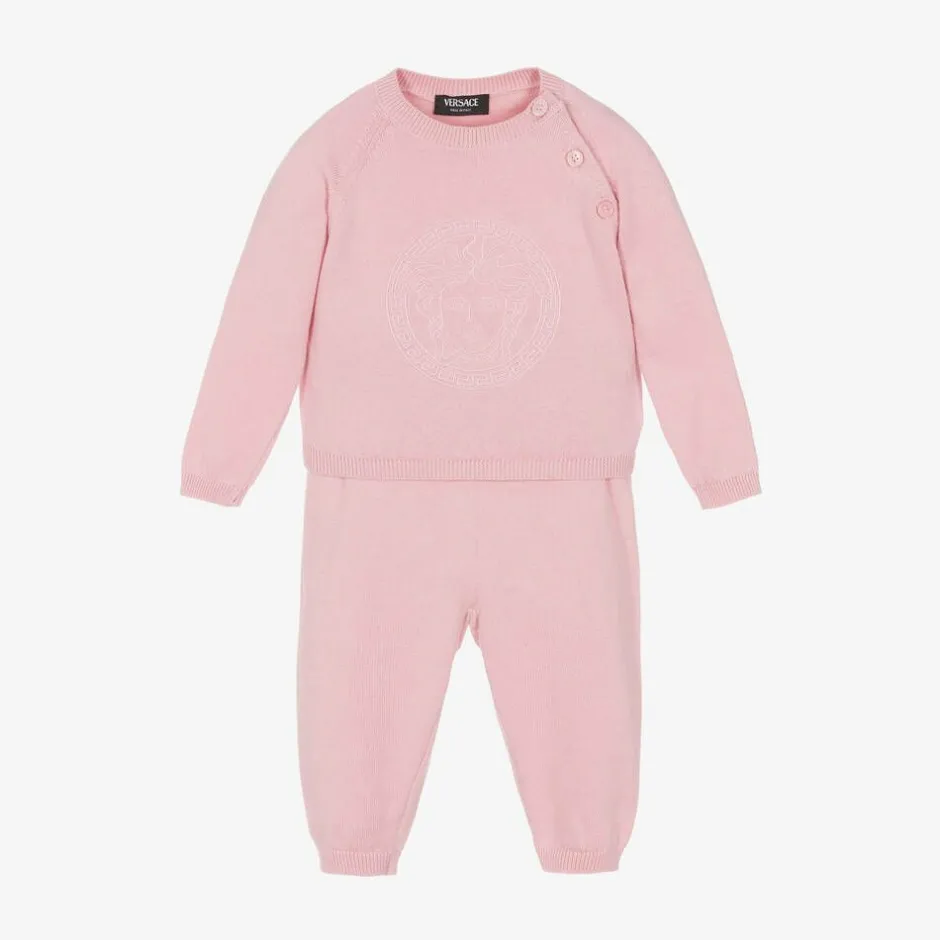 In luxurious cotton and cashmere, this light pink knitted trouser set for baby girls is from Italian fashion house Versace. Enhanced by the designer's embroidered Medusa artwork, the sweater fastens with branded mother-of-pearl buttons on the shoulder and the cuffed trousers have an elasticated waistband for lasting comfort. A wonderful present idea, these items come with a branded gift box.