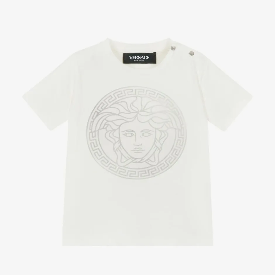Off-white short-sleeved T-shirt for baby boys and girls by Italian luxury designer Versace. For a distinctive look, the front is printed with a Greca framed Medusa logo in metallic silver. Made in soft cotton jersey, this casual tee has a crew neckline and silver-tone poppers on one shoulder to assist with dressing.