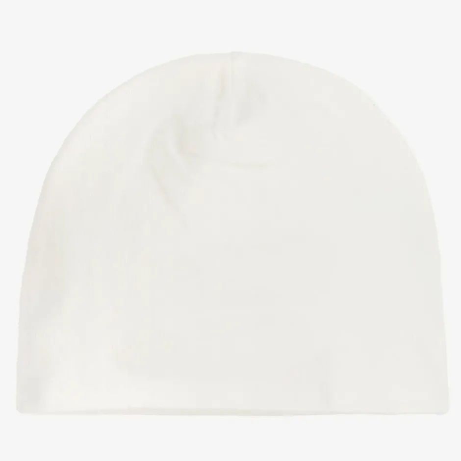 Luxuriously soft layette hat in off-white from Italian brand Versace for baby boys and girls. It is made in a double layer of soft cotton jersey, with a gold foil Medusa logo print.