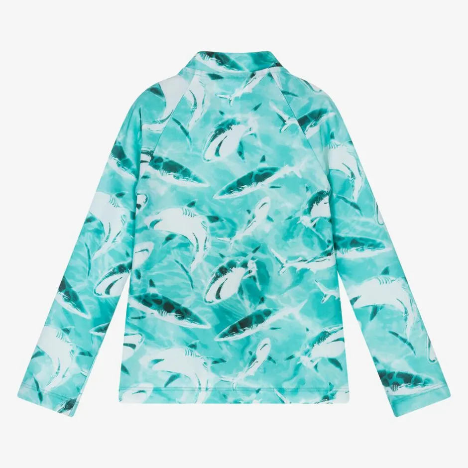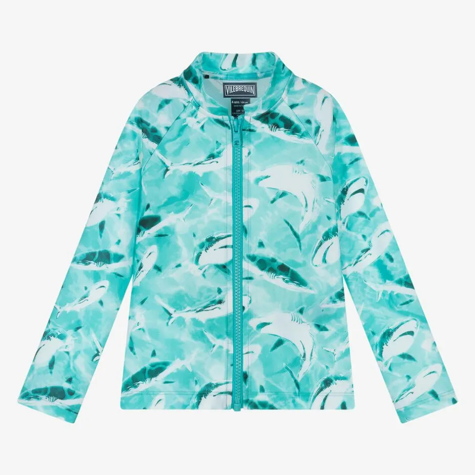 Aqua blue zip-up swim top for boys by Vilebrequin, patterned in a cool shark print. Silky soft and stretchy, this sun protective top has a high neck and is made from recycled Econyl fabric with UPF50+.