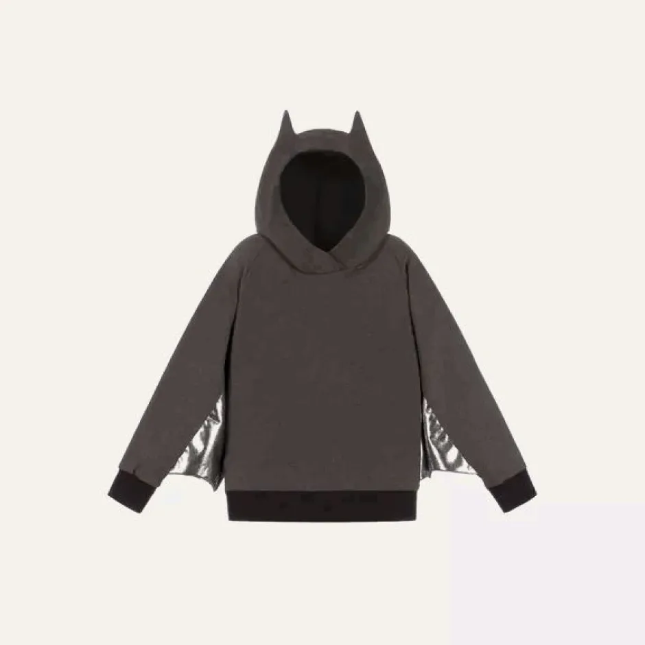 Fun, eye-catching dark grey hoodie for boys and girls by Wauw Capow. Cool for both trick-or-treating and casual play days, the lined hood has cute, 3D bat ears, and the sleeves have shimmery silver batwing panels for added fun. It is made from super soft, brushed jersey with cosy, black, ribbed trims.