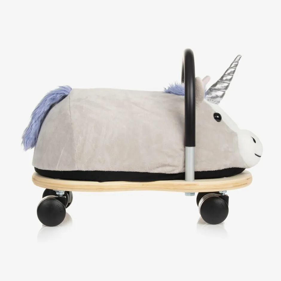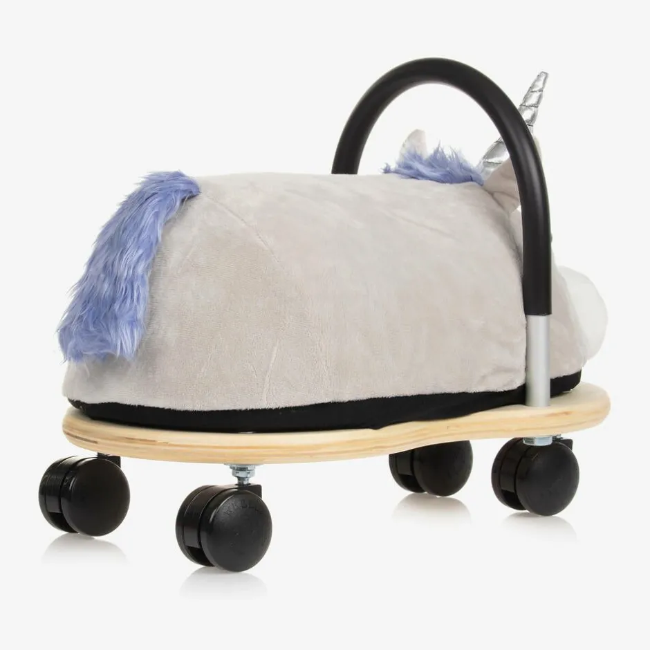 A cute grey ride-on toy for little boys and girls by Australian brand Wheely Bug, with a removable unicorn plush cover. Ensuring a comfortable ride for your little one, it features a lightly padded faux leather seat, a smooth handle and a strong plywood base. With a softly padded face, a spiral horn and fluffy tail, this magical character toy is ideal for imaginative play, whilst developing coordination and enhancing motor skills. The wheels can be turned in any direction for effortless movement and a fun-filled, smooth journey.