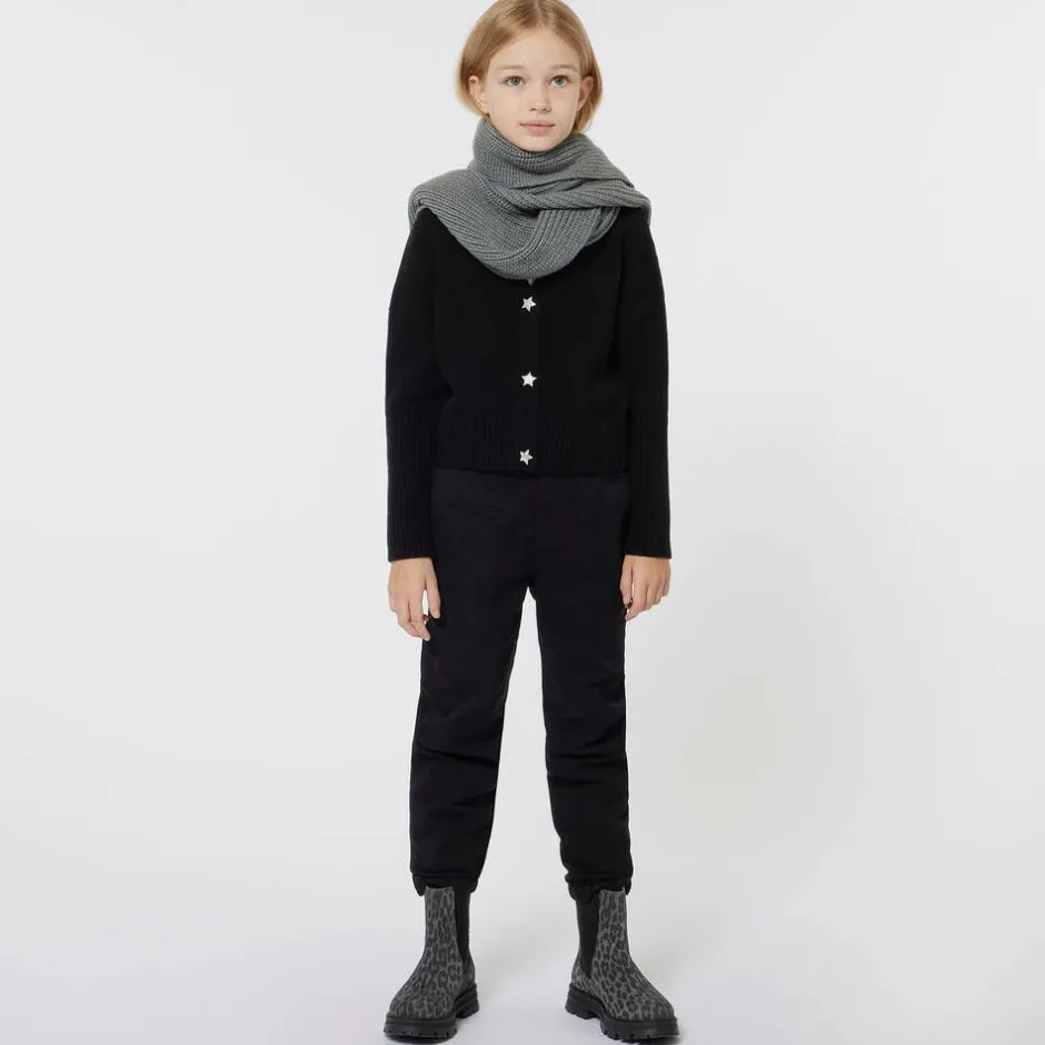 Inspired by the adult collection, this black v-neck cardigan for girls is by French brand Zadig&Voltaire and is knitted in a soft wool blend. Ideal for layering this comfortable, stylish piece has a deep ribbed hem and cuffs and sits on the hip with a slightly cropped look. It fastens with sparkly star-shaped buttons and has a cutwork logo on one side for a discreet designer finish.
