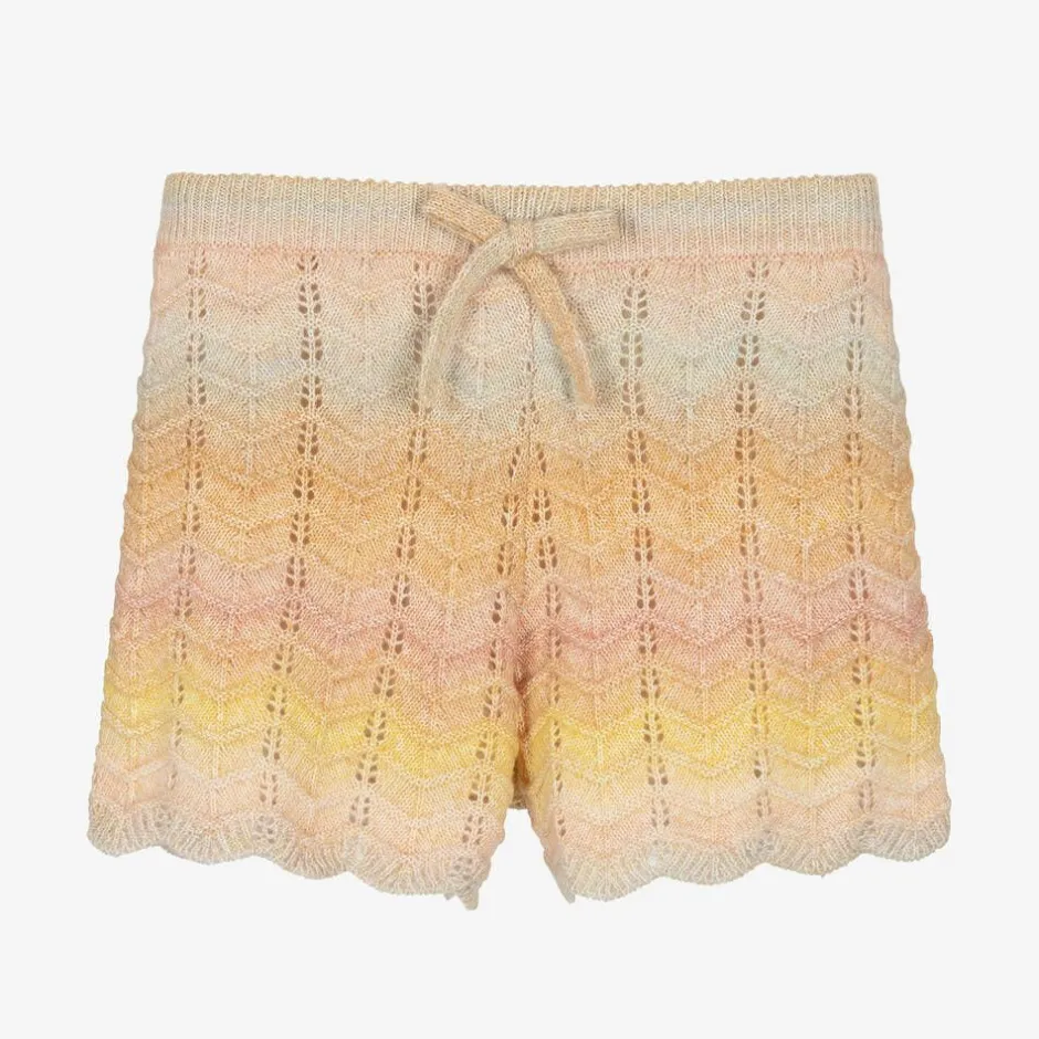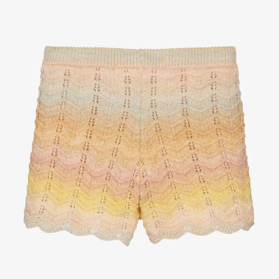 Lovely cotton knit shorts for girls by luxury brand Zimmermann, with a pink, orange and yellow ombré effect. Lined in lightweight voile for comfort and modesty, they have a stylish pointelle knit chevron design, scalloped edging and a fixed bow on the gently elasticated waistband.