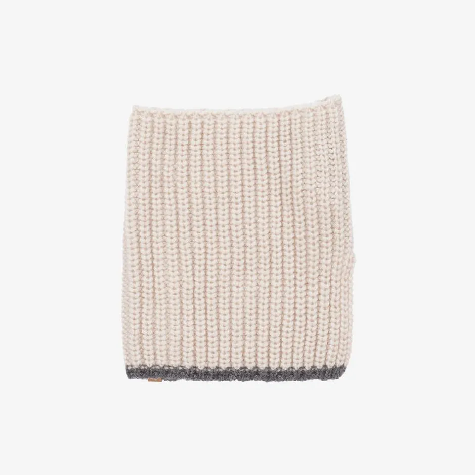 Beige snood for boys and girls by Spanish brand 1 + in the family, knitted in a soft Merino wool blend. Warm and cosy, this ribbed snood has a grey trim and a subtle logo tab.