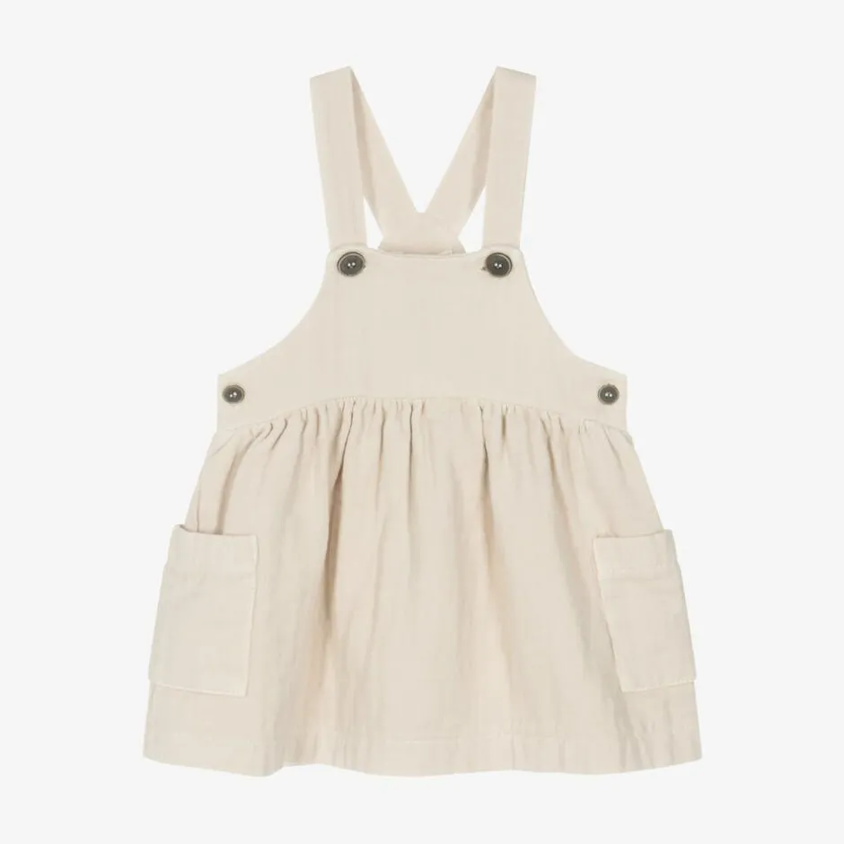 Ivory cotton pinafore dress for little girls by Spanish brand 1 + in the family. With cute patch pockets on the gathered skirt, it fastens with buttons on the front and sides. The bodice is lined for comfort.