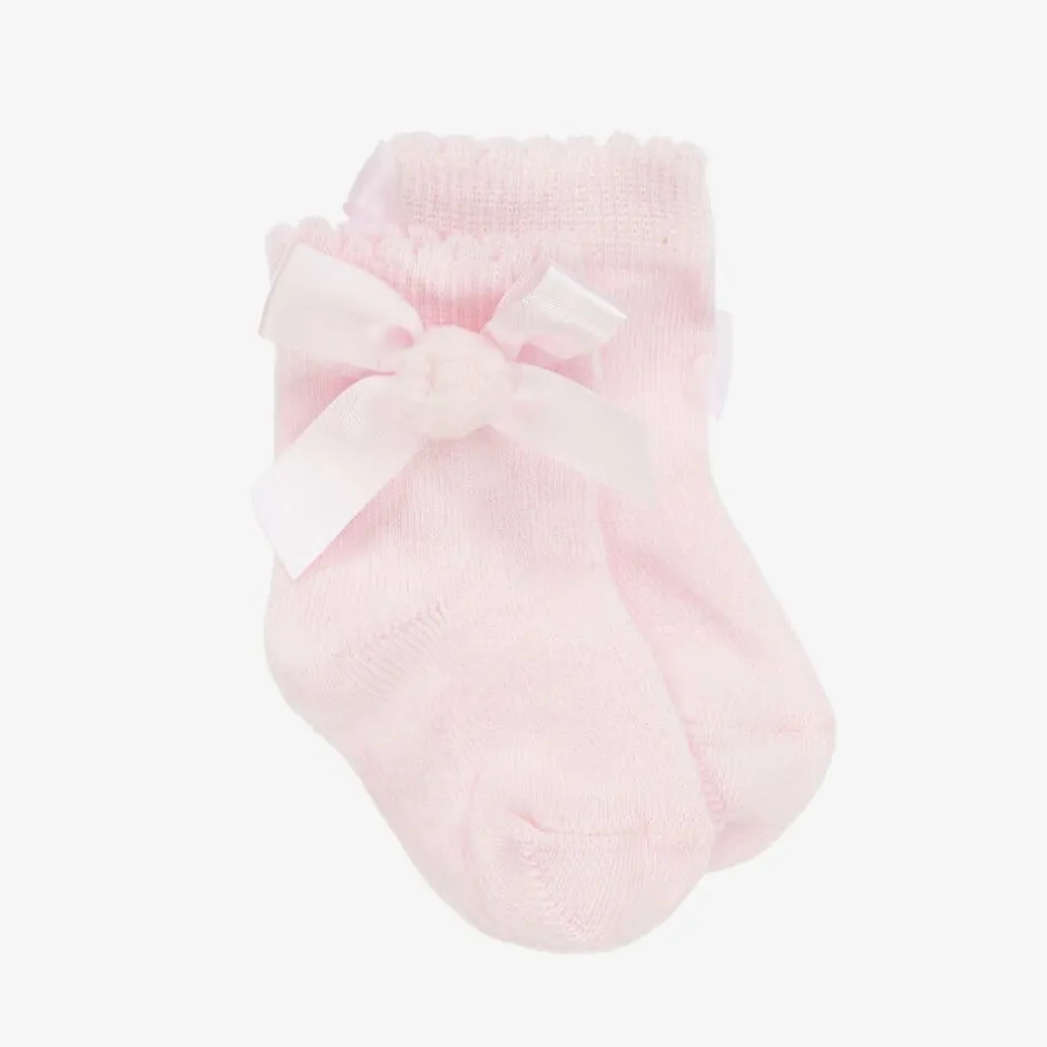 Pretty pale pink ankle socks for baby girls from Little A by A Dee. They are decorated with a silky ribbon bow and pom-pom detail for a delightful finish. Made from a soft cotton knit, they have sweet scalloped edges and subtle logo details on the soles of the feet.