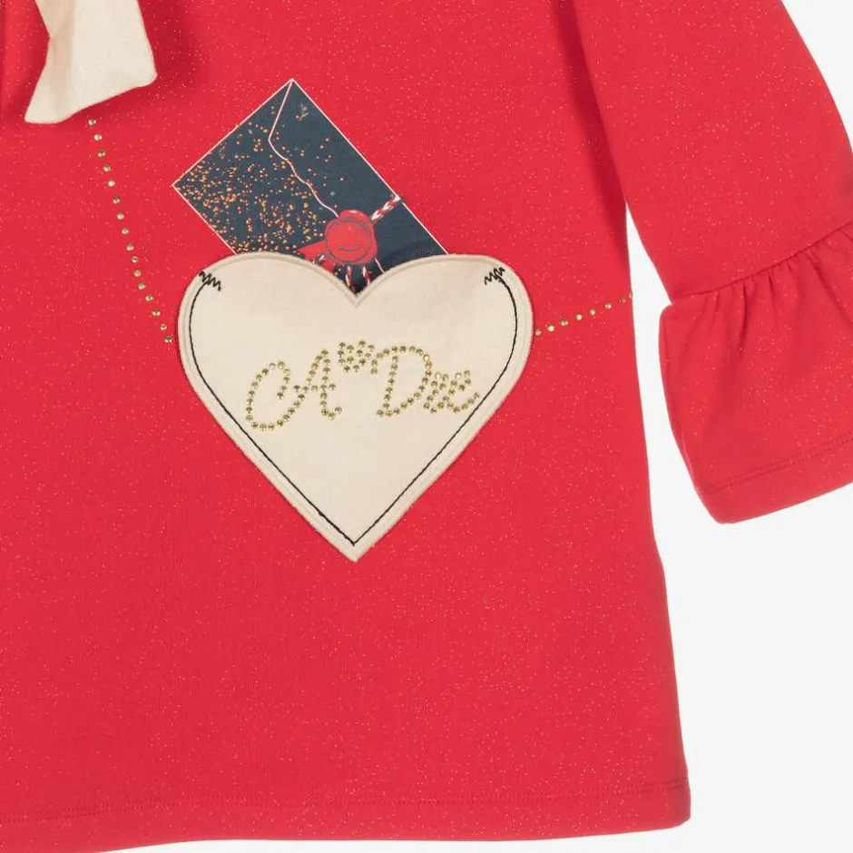 Girls bright red cotton dress for girls with a glittery gold finish by British brand A Dee. It has a beige, heart-shaped, handbag appliqué pocket and bow on the front, sparkling with a diamanté strap and logo. A-line in shape, it is made in comfortable jersey with a warm, fleecy inside. It has a ribbed neckline, ruffled cuffs and is easy to wear, simply pulling on.