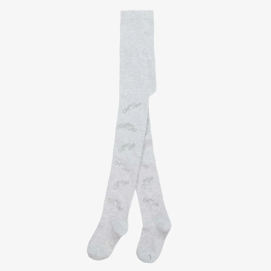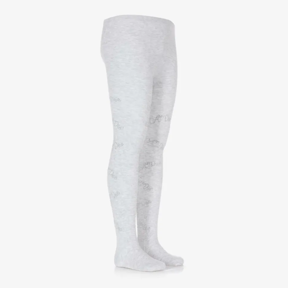 Lovely grey marl tights for girls by A Dee. Comfortable to wear, they have an elasticated waist and are made from a soft knit. For a touch of sparkle and a branded look, they are decorated with pretty silver diamanté logos on the legs.