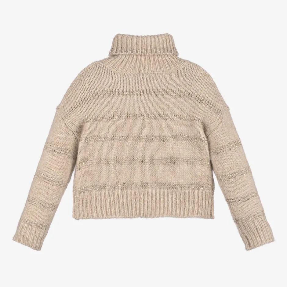 A gorgeous beige rollneck sweater for girls by Spanish brand Abel & Lula. It is patterned in pale gold stripes, embellished with shiny gold sequins for added sparkle. Cosy and comfortable, it is made in a soft and fluffy knit, with long sleeves. This product contains recycled fibres.