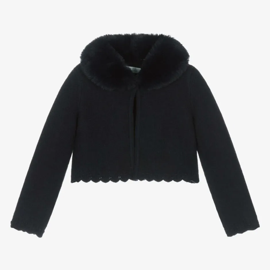 Lovely navy blue knitted cardigan for girls by Abel & Lula, fastening with a single button on the front. It has an elegant plush collar which can be fully detached with buttons for an alternate look. There is sweet scalloped edging on the hem and the cuffs.