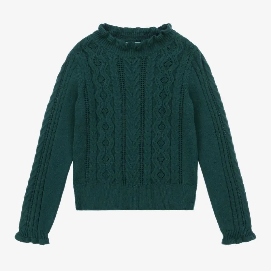 Emerald green sweater for girls by Abel & Lula, knitted in a super soft viscose blend. With sweet cable knit details and pointelle stripes, this warm layer has frills on the neckline and the cuffs.