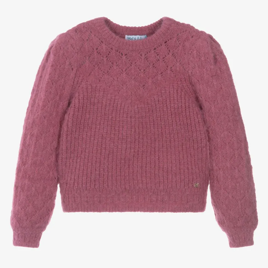 Lovely pink sweater for girls by Spanish brand Abel & Lula, made in a beautifully fluffy, mid-weight knit. With both ribbed and diamond patterns, this cosy top has prettily puffed sleeves and a little golden metal logo charm stitched by the hem.