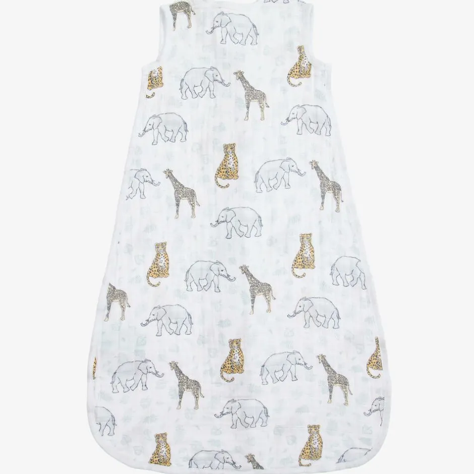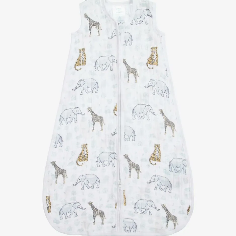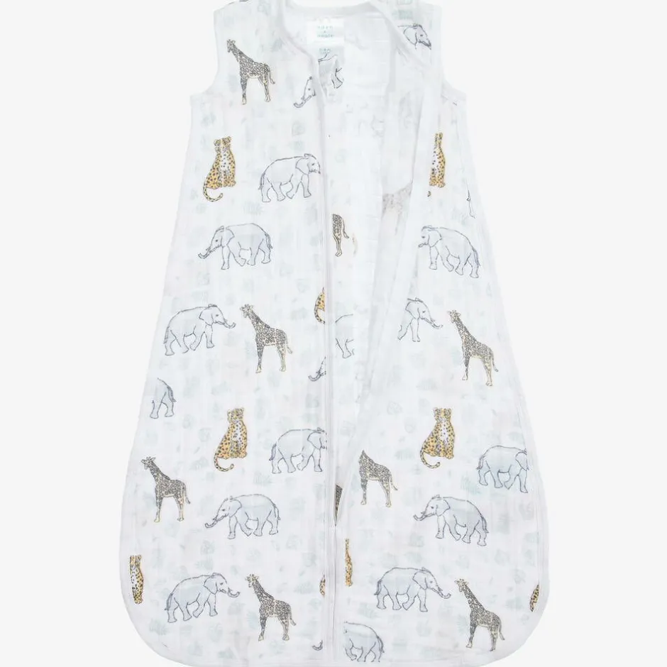 Suitable for baby boys and girls, a white cotton muslin sleep bag by aden + anais. Super soft and lightweight with a 1.0 tog warmth rating, it fastens with a zip on the front and has a fun jungle animals print.