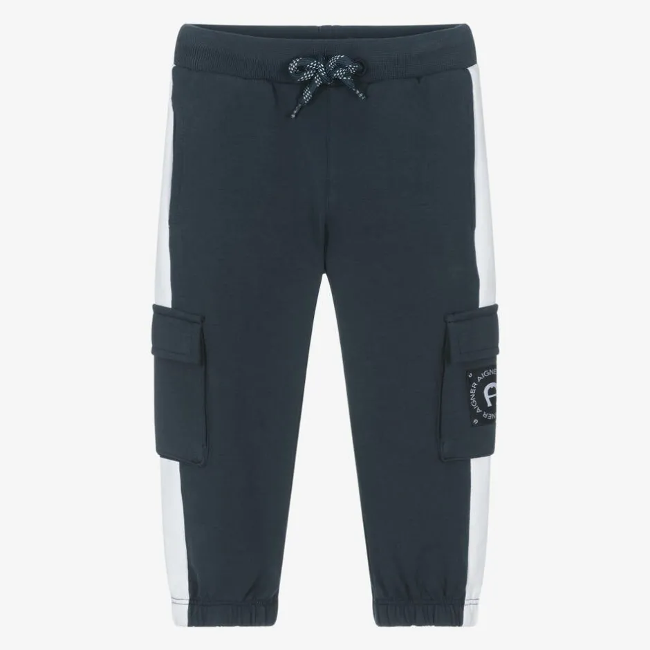 Navy blue joggers for baby boys by AIGNER, made in soft cotton jersey. This casual style has sporty white trims, side seam pockets and a drawstring waistband for a comfortable fit. There are cargo-style pockets on both legs, one of which features a navy blue 'A' horseshoe branded patch.
