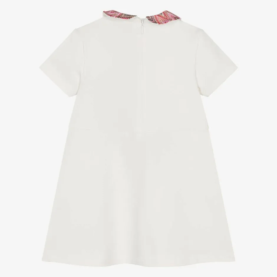 Ivory cotton dress for baby girls by AIGNER, made in soft and comfortable cotton jersey. It is designed in a gentle A-line shape with pretty contrast trims in a softly woven pink and beige zigzag pattern. Fastening with a concealed zip on the back, it has a smart rounded collar, faux front placket and faux pockets, trimmed with beautiful gold and pearl buttons. An embroidered gold logo on the chest features the signature 'A' horseshoe motif for a distinctive designer touch.