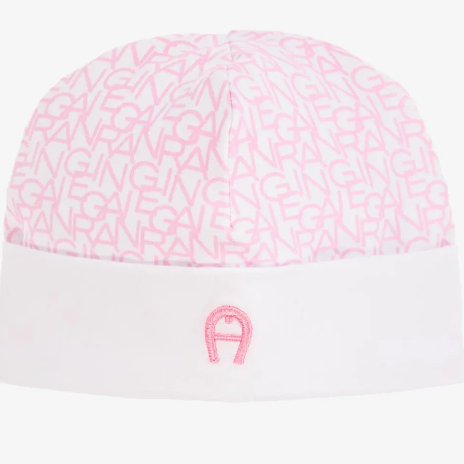Baby girls pink and white logo print hat by AIGNER. It is made from soft and stretchy Pima cotton jersey with the 'A' logo embroidery on the turn-up.