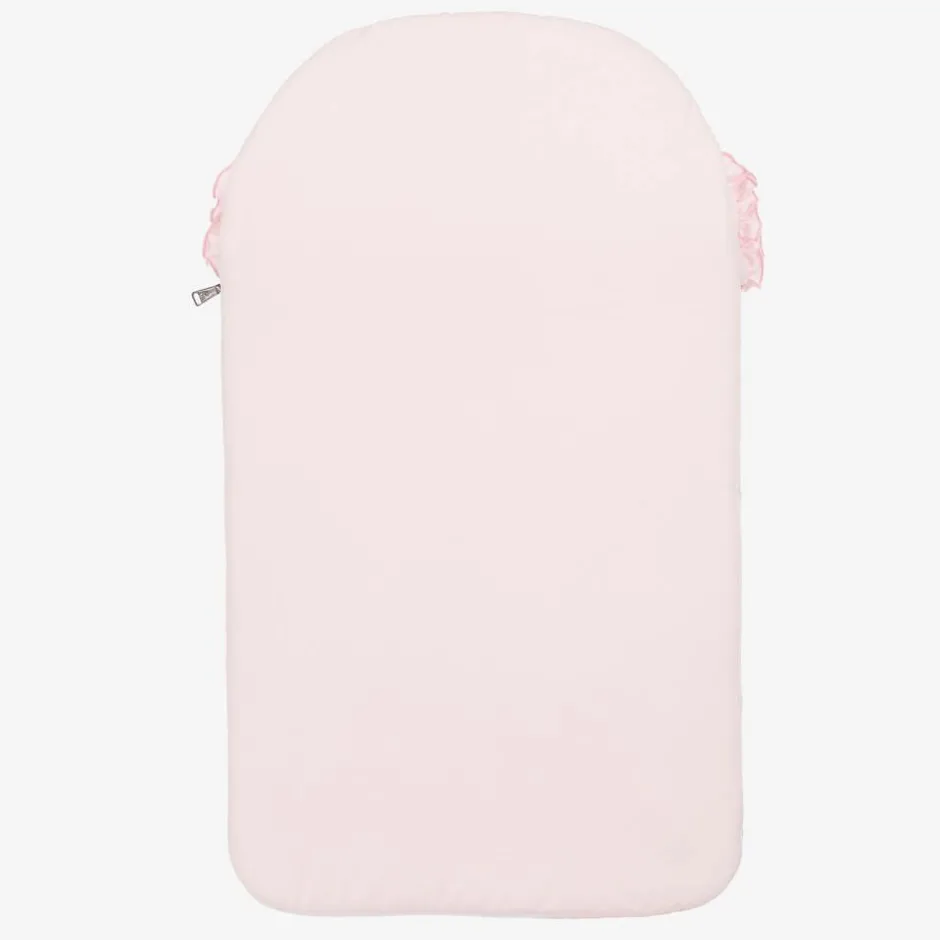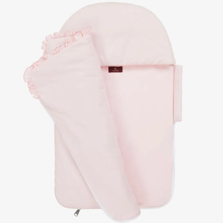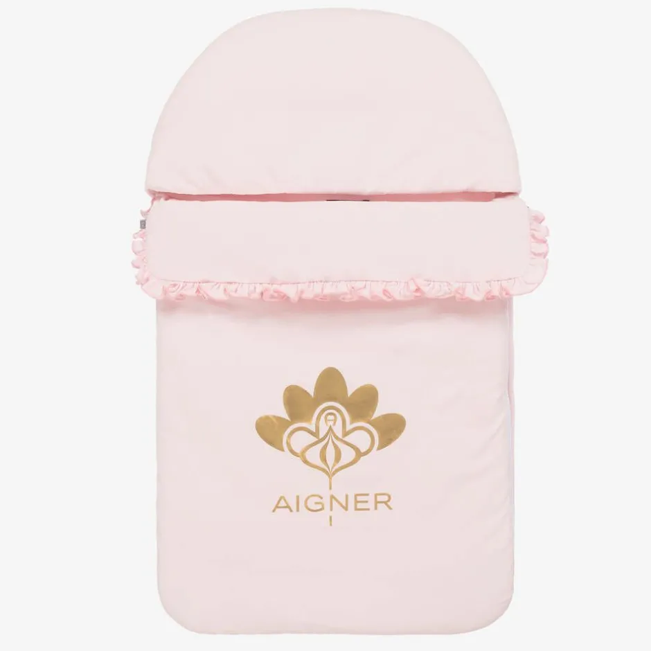 Pink nest for baby girls by AIGNER, made in super soft Pima cotton jersey. Warmly padded, with a cosy hood, it has a zip fastening down one side and along the base for easy access and a pretty, frilled fold-down front. For a distinctive look, a shimmering metallic gold floral logo design can be seen on the front incorporating the signature 'A' horseshoe logo.