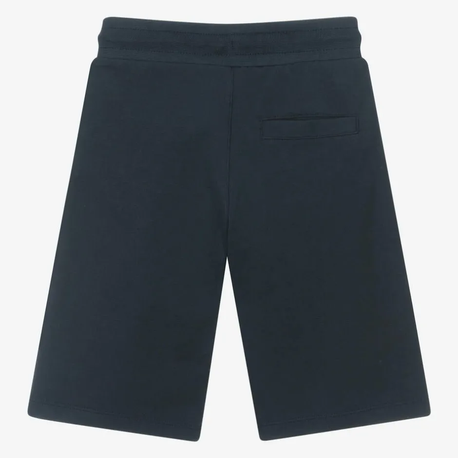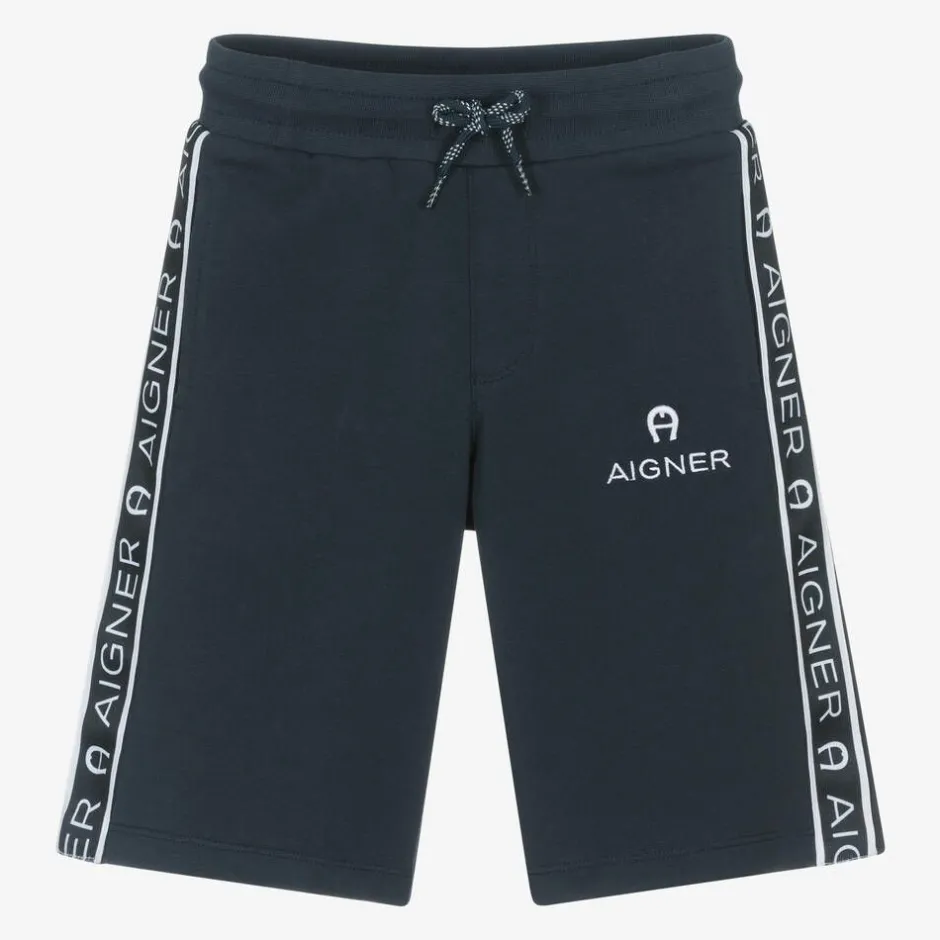 Navy blue cotton shorts for boys by AIGNER, with branded taped trims. Made in soft jersey, these casual shorts have white logo embroidery on the front, featuring the signature 'A' horseshoe. They have useful pockets concealed in the side seams and a drawstring waistband for a comfortable fit.
