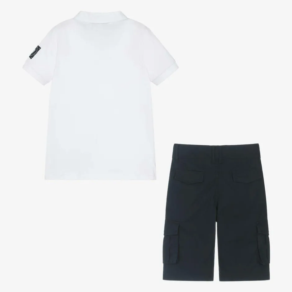 Detailed with shiny gold logos, featuring AIGNER's signature 'A' horseshoe motif, a white and navy blue cotton shorts set for boys. The soft jersey polo shirt fastens with buttons at the neck and has a logo patch on one sleeve. It pairs with Bermuda-length cargo shorts. Soft and lightweight, they fasten with a zip and button and have a comfortable, adjustable waistband.