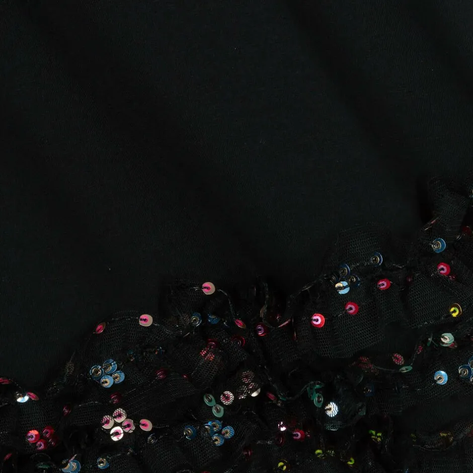 Black dress for girls by AIGNER, made in soft cotton jersey. In a simple, yet elegant design, this comfortable A-line shaped dress has a stylish handbag and logo motif on the front in glittery gold and pink. The hemline is trimmed with colourful sequinned ruffles that sparkle beautifully in the light.