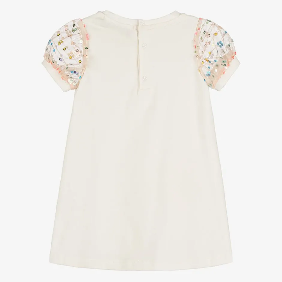 Ivory dress for little girls by AIGNER, with a pink and gold handbag logo motif on the front. Made in soft cotton jersey, it is styled in a comfortable A-line shape with popper fastenings on the back. The puffed, semi-sheer tulle sleeves are embellished with colourful sequins for a pretty finish.