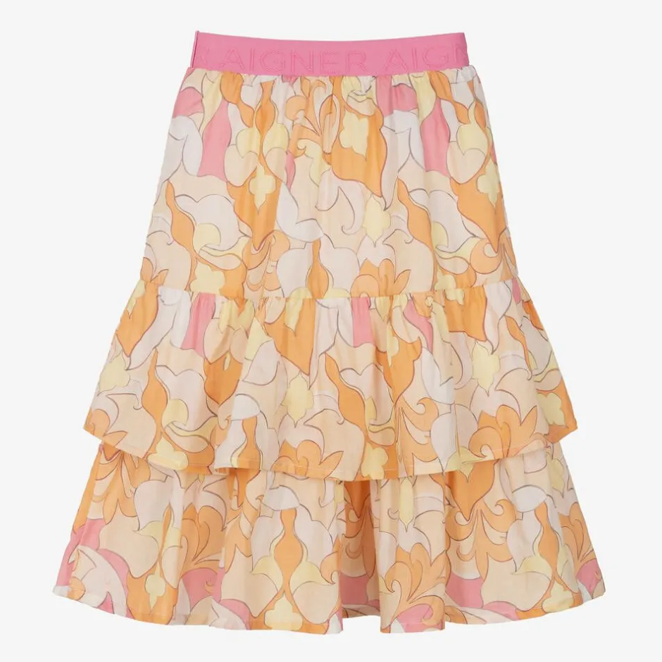 Girls summery tiered skirt by AIGNER, with a gorgeous, ornate pattern in pink and pale orange. Ideal for warm days, it is made and lined in lightweight cotton and has a comfortable, pink, elasticated waistband with repeat jacquard logos.
