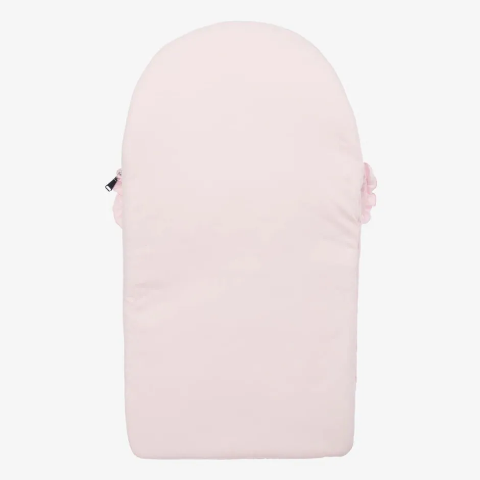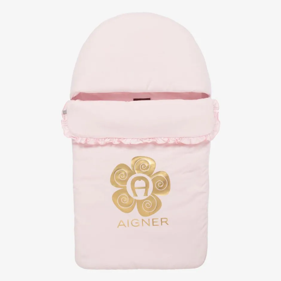 Pink nest for baby girls by AIGNER, made in super soft Pima cotton jersey. Lightly padded for warmth, it has a zip fastening down one side and along the base for easy access and a frilled fold-down front. For a distinctive look, a shimmering metallic gold logo design can be seen on the front incorporating the signature 'A' horseshoe logo.