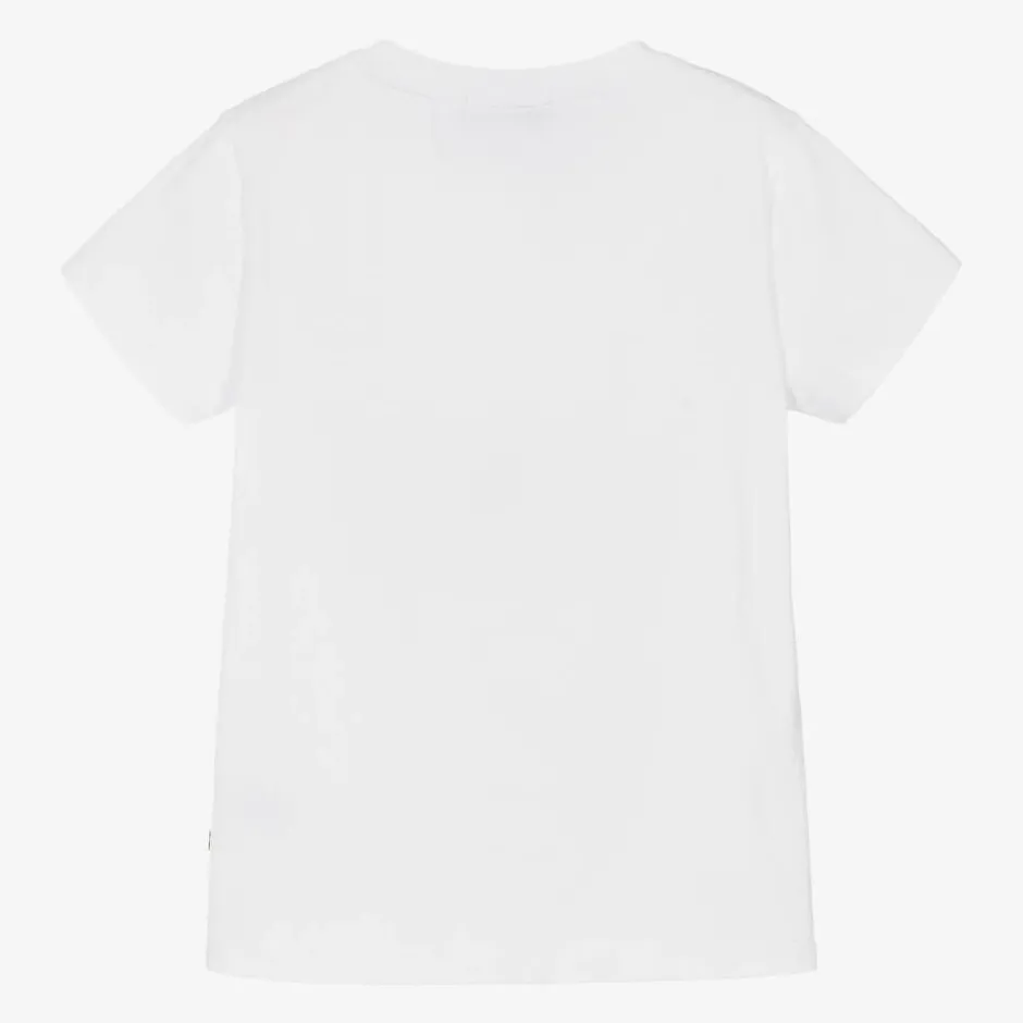Girls white T-shirt by AIGNER, made in soft cotton jersey. It has cute pink trompe-l'œil handbag print across the front with signature 'A' horseshoe logo gold charms.
