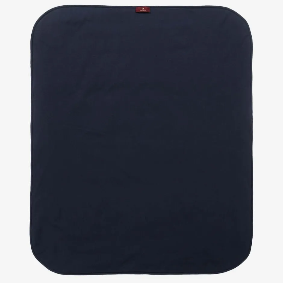 Navy blue Pima cotton blanket for baby boys and girls by AIGNER. Cosy and comfortable, it is made in super soft jersey and lightly padded. For a statement look, one side is printed with a bold signature 'A' horseshoe in metallic gold. Ideal for use in the car or stroller, it also makes a lovely nursery accessory.