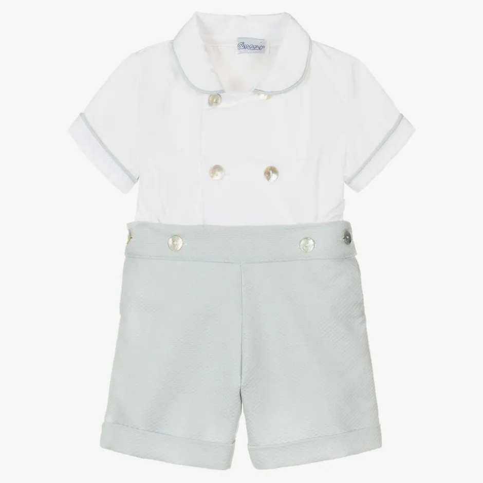 Little boys grey and white cotton shorts set by Ancar, made exclusively for Childrensalon. Traditionally styled, the lightweight shirt has a Peter Pan collar, grey trims and mother-of-pearl buttons on the front. The coordinating shorts have a lightweight lining, turn up hems and are partly elasticated at the waist for comfort. Both pieces button together for a neat and tidy look.