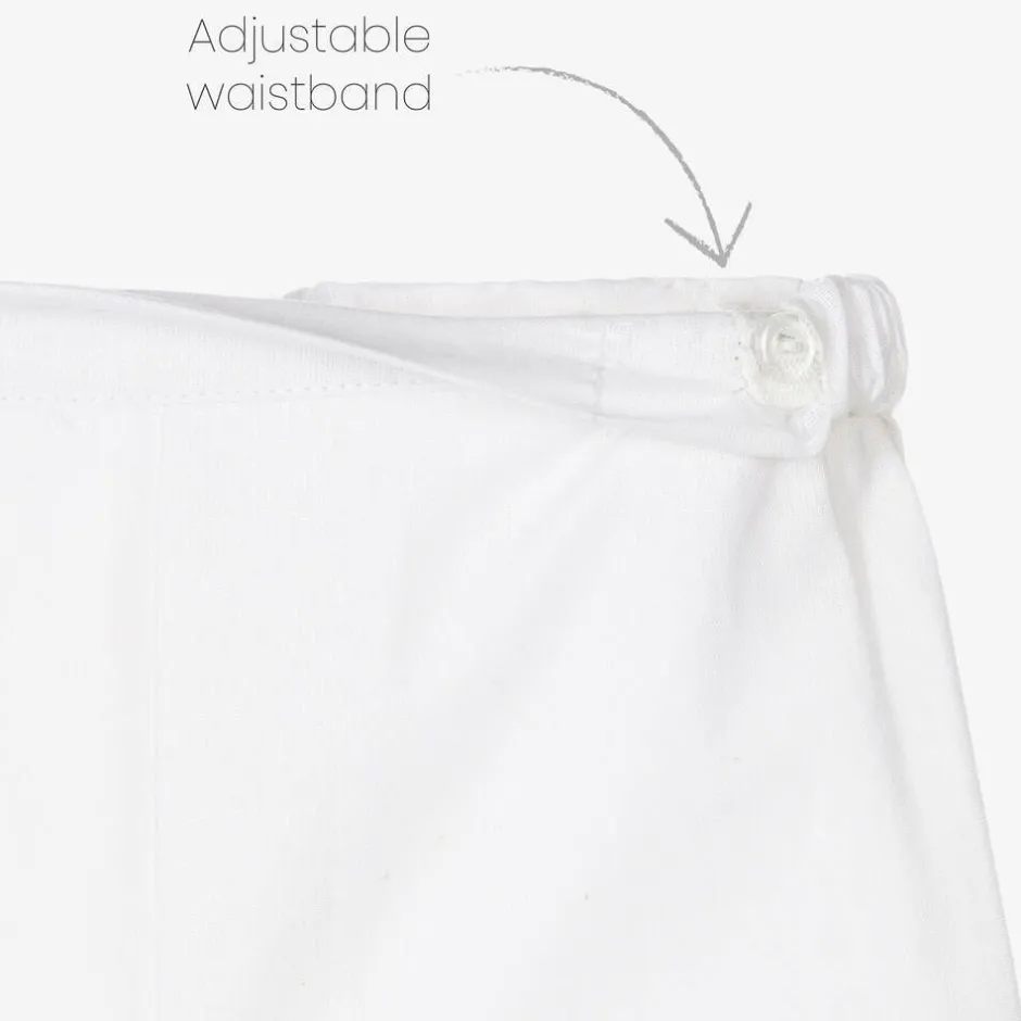 Smart and traditional, this navy blue and white sailor suit for little boys is by Andreeatex. The outfit comprises a cotton shirt, with a jacket, trousers and cap made in lightweight linen with a comfortable cotton lining. The easy pull-on trousers have an adjustable, elasticated waistband for a comfortable fit and the shirt comes with a detachable navy blue bow tie. Completing the look, the jacket and cap have navy blue nautical trims and the jacket has a lovely gold embroidered anchor on the chest, and gold crest button fastenings.