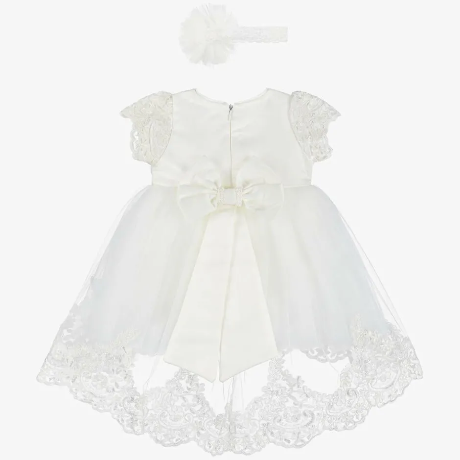 A pretty ivory dress set for little girls from Andreeatex. The satin bodice has delicate ivory lace, with a fixed tulle and pearl waistband. The skirt has layers of tulle and matching lace trim, with a detachable satin bow and a longer hem on the back. Lined in lightweight cotton for comfortable wear, the dress fastens neatly with a concealed back zip. This gorgeous set comes with a lace and tulle headband to complete the look. Smaller sizes come with knickers.