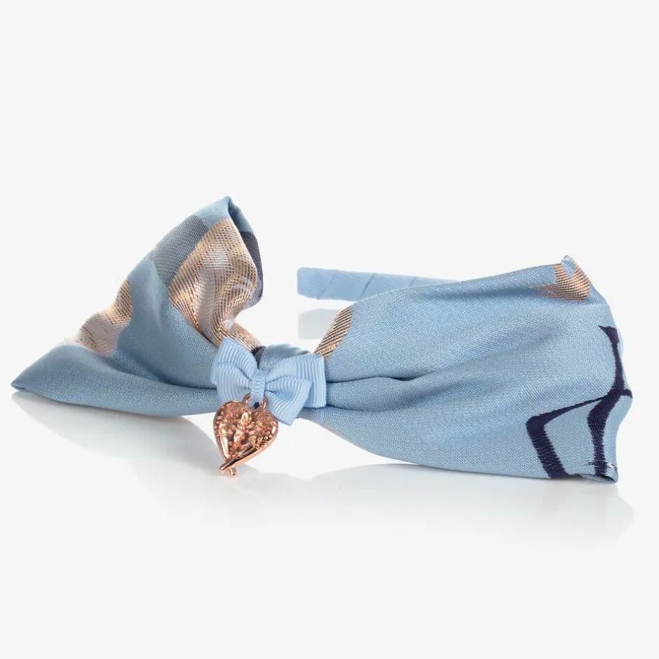 A beautiful pale blue and gold hairband for girls by Angel's Face. It has a flexible band covered in grosgrain ribbon, a large pale blue jacquard bow with a floral pattern in shades of navy blue and metallic rose gold. There is a rose gold, angel wing heart logo charm, attached to the centre.