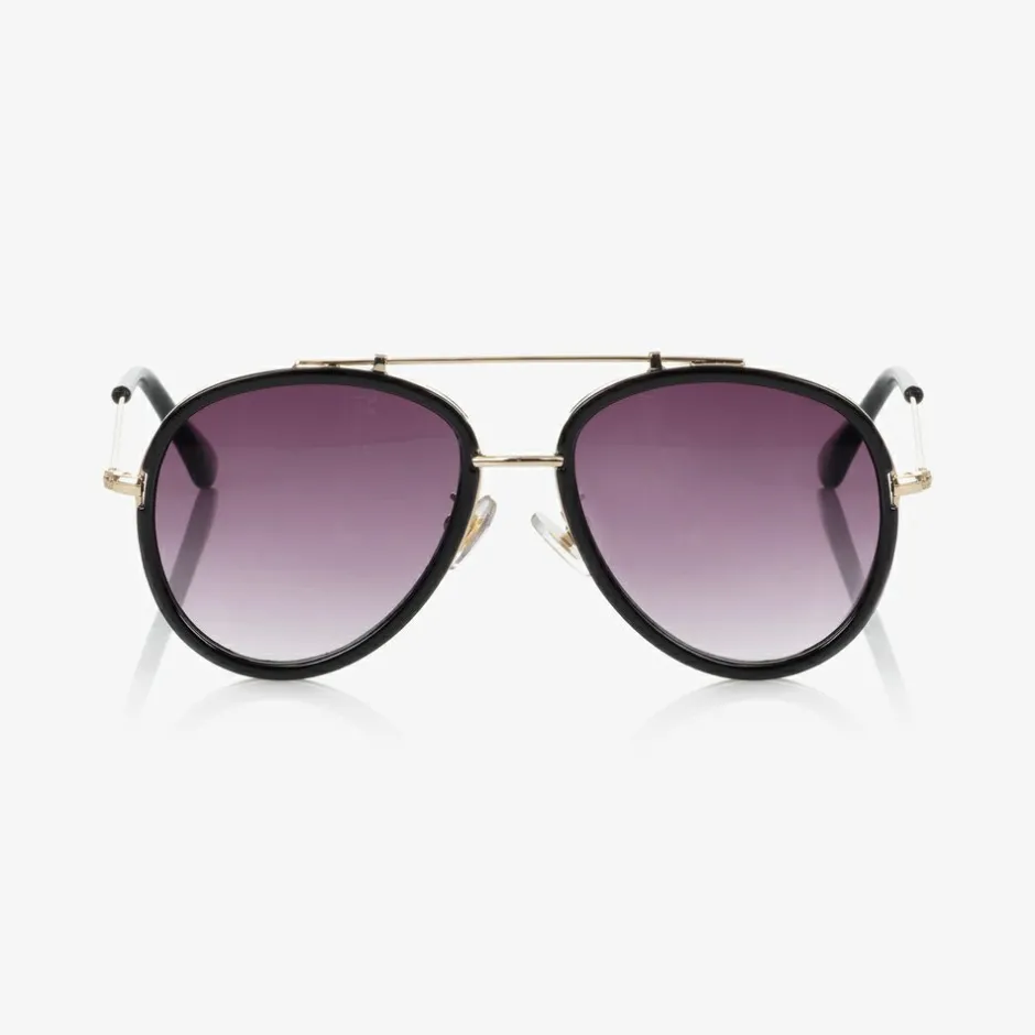 Girls stylish aviator sunglasses by Angel's Face, with a black and gold frame and black tinted lenses. They have UV protection and come with a pink hard case.