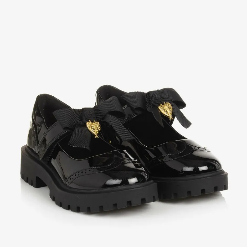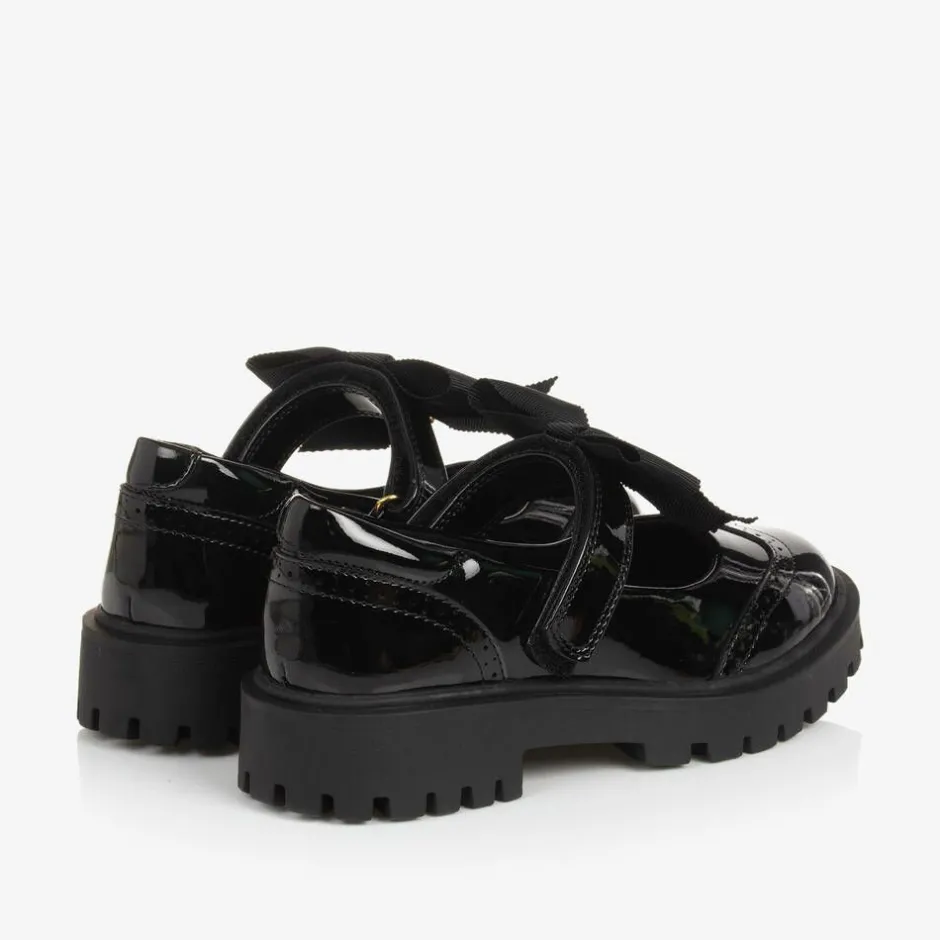 Girls black Mary Jane shoes by Angel's Face, made in glossy faux patent leather. They fasten easily with a velcro strap, trimmed with the designer's signature grosgrain bow and golden heart charm. Ideal for school, they are lined in soft textile and lightly padded for comfort, with chunky non-slip rubberised soles for safety.