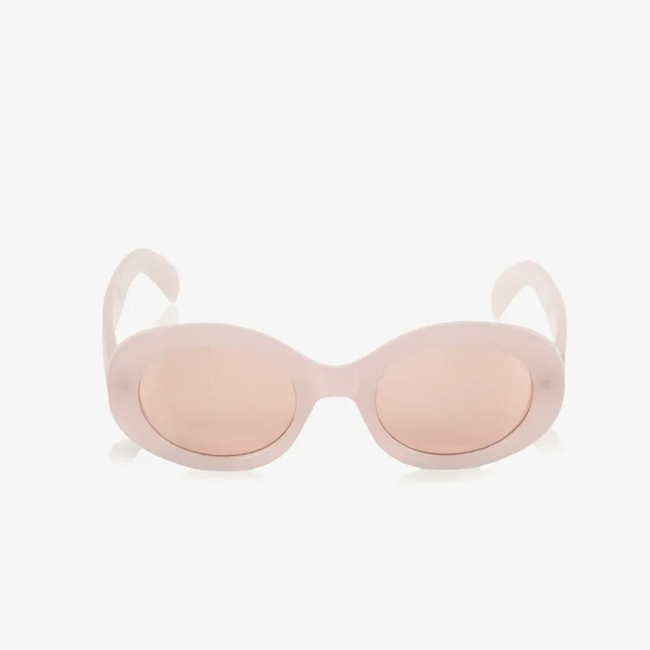Stylish pink sunglasses for girls by Angel's Face, with an oval shape and chunky frame. They have chic pink tinted lenses and come in a in a shiny pink case, complete with a soft cleaning cloth.