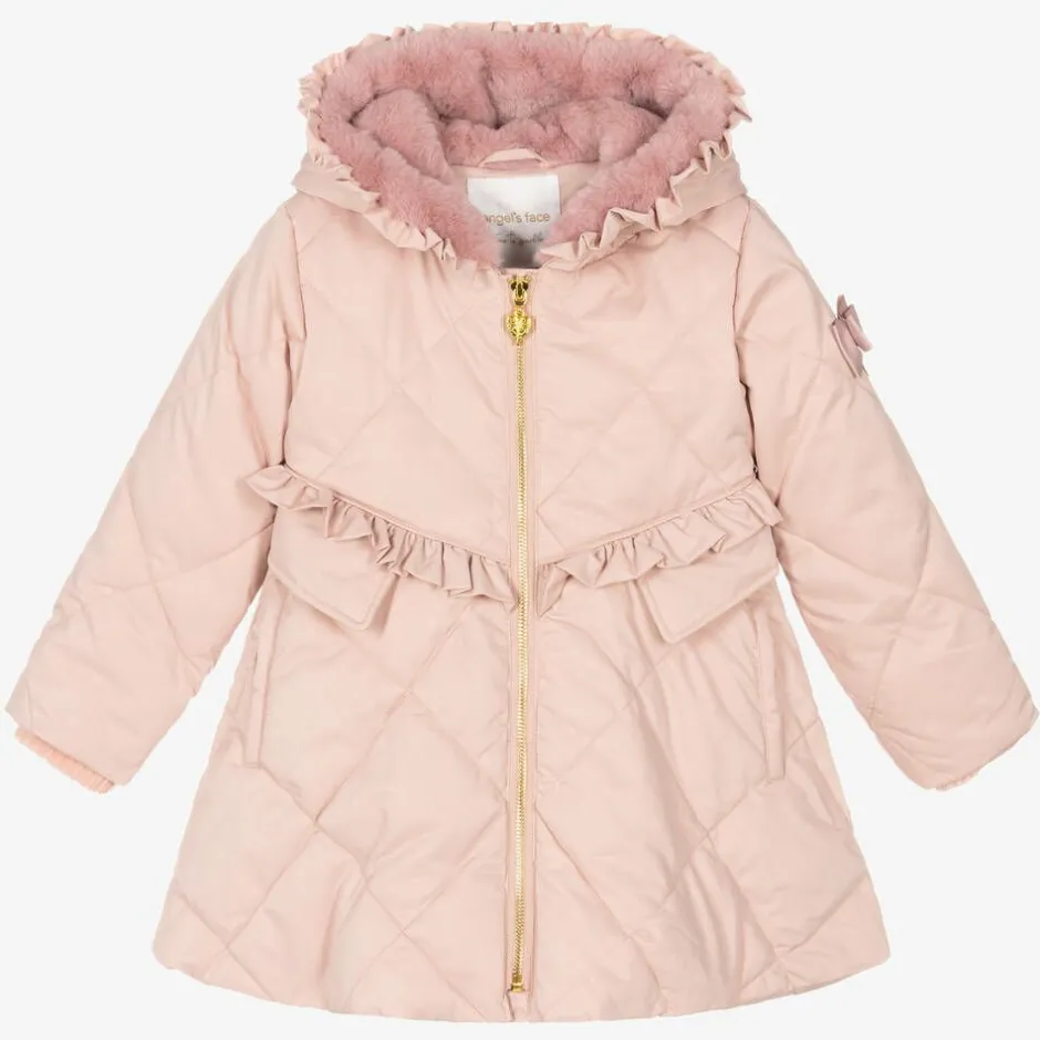 Glamorous rose pink quilted coat for girls, by Angel's Face. Trimmed with stylish ruffles, it has a shiny gold branded zip pull and a matching heart and bow logo charm on one sleeve. The ribbed chenille internal sleeve cuffs keep out cold chills and the snuggly plush hood lining ensures a pretty yet practical fit.