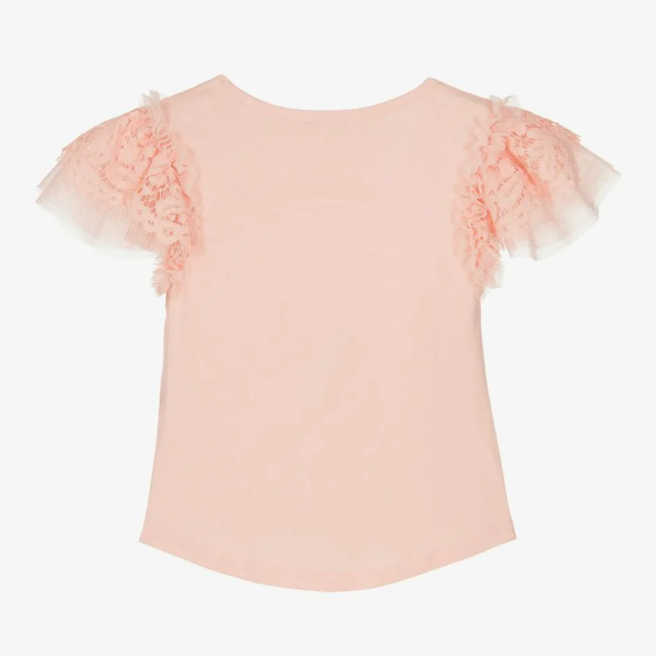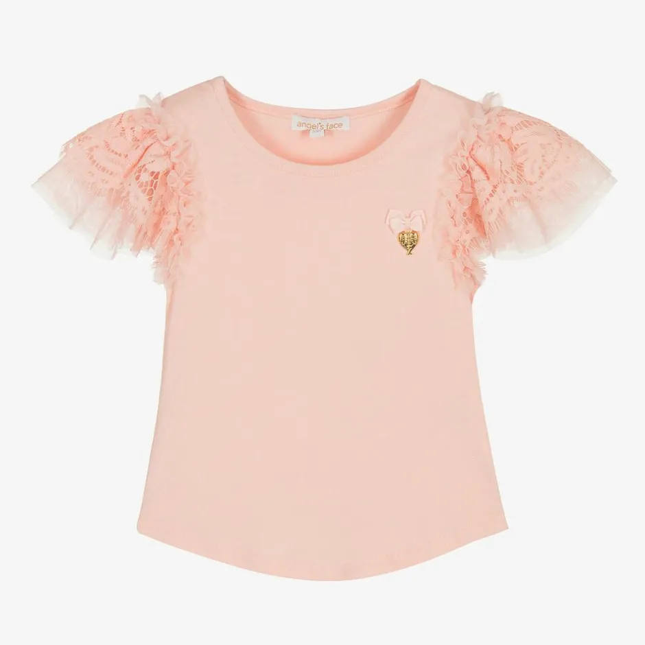 So pretty and feminine, this blush pink top for girls is by Angel's Face. It is made in super soft cotton and modal blend jersey with stand-out sleeves, layered in ruffles of beautiful lace and tulle. The brand's sweet golden heart charm and bow is stitched on the front.