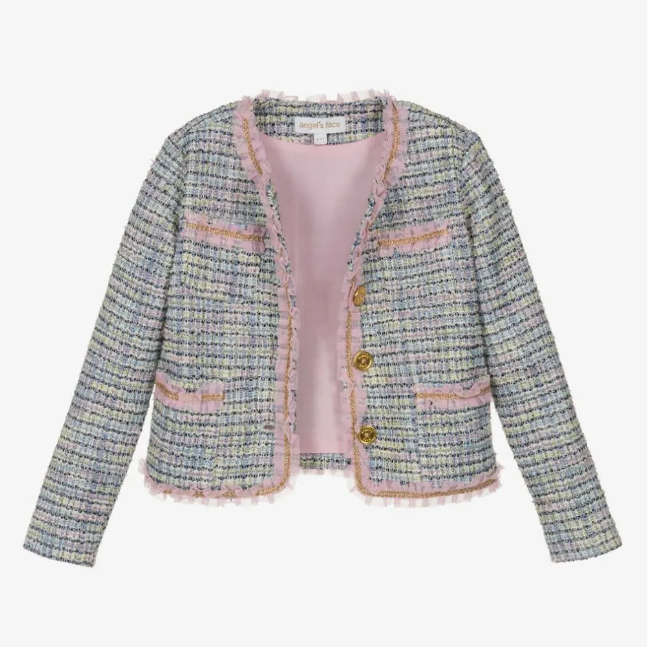 A lovely jacket and skirt set for girls by Angel's Face, in gorgeous pink and blue tweed. Lined with soft crêpe, the jacket has a sophisticated round neckline and gold button fastenings on the front. It has pink tulle trims and small front pockets with gold braid detailing. The matching skirt has pretty tulle trims and a stretchy, adjustable waistband for a great fit. The brand's signature gold heart charm and grosgrain bow are on the front, for an added designer touch.