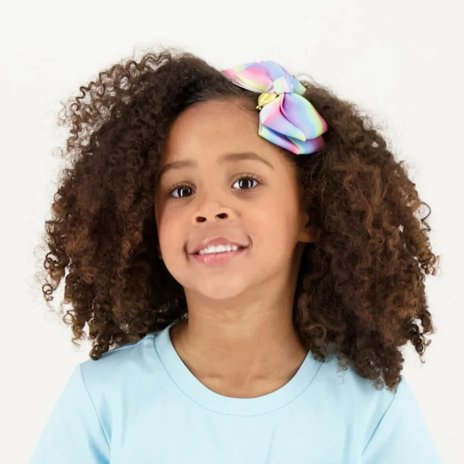 Girls multicoloured double bow hair clip by Angel's Face, made from soft grosgrain ribbon. This pretty hair accessory has the brand's signature gold wings charm sewn on the front and secures with a metal clip.