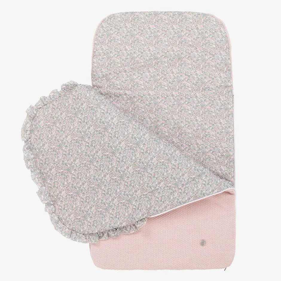 A delightful pale pink knitted baby nest for girls by Spanish brand Artesania Granlei. Lightly padded for a cosy comfort, it has a soft white cotton lining patterned in delicate pale pink and blue floral with a sweet ruffle trim. A long zip fastens all the ways from one side to the other side for easy access and creates soft and flat surfaces for your little one to lie on. A faux mother-of-pearl logo charm is stitched on the front for a sweet finishing touch.