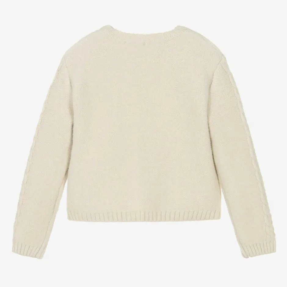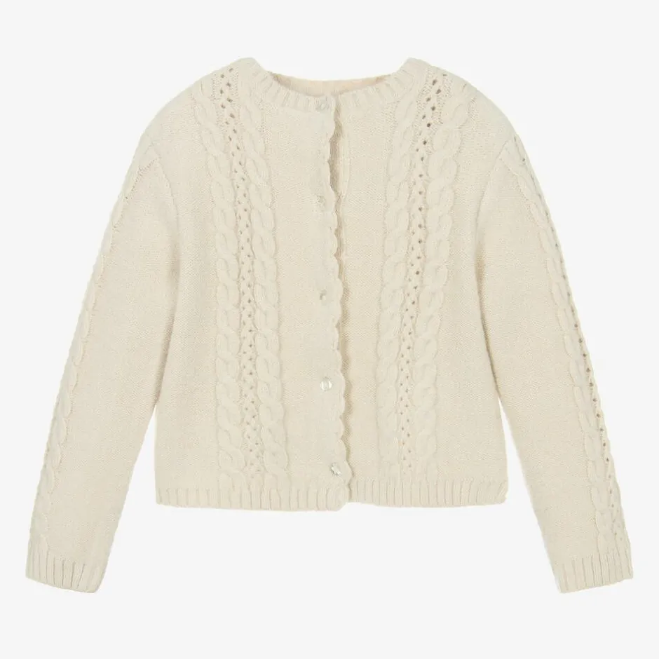 A charming beige cardigan for boys and girls by Babidu. Knitted with a touch of wool for cosy comfort, this classic layering piece has cable knit details and beautiful openwork designs. It fastens with neat buttons on the scalloped placket.